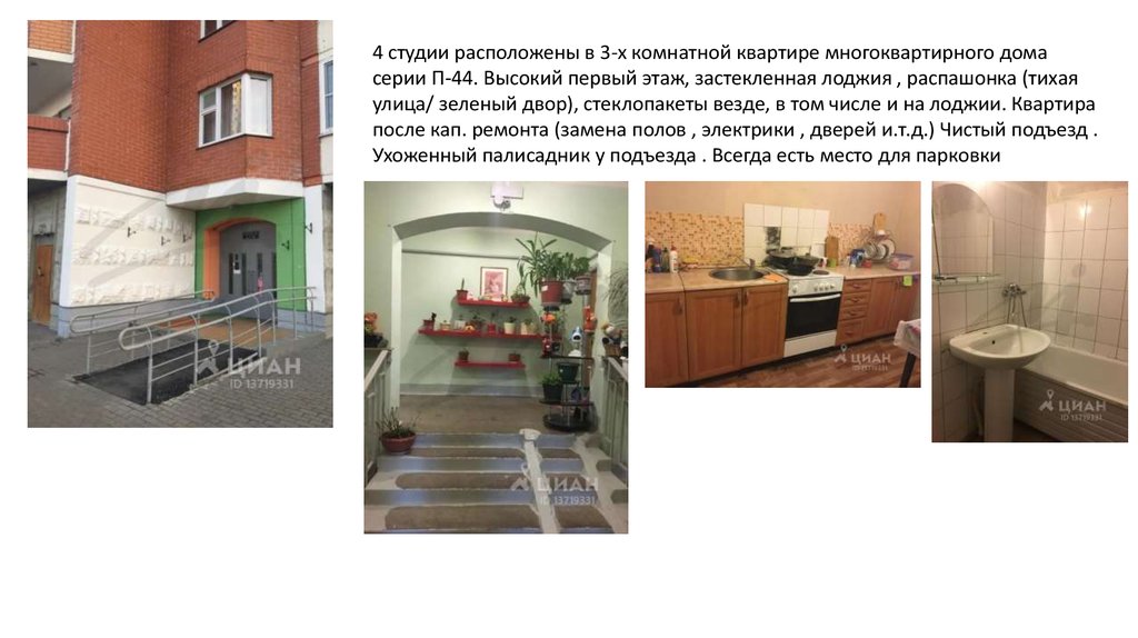 4 студии расположены в 3-х комнатной квартире многоквартирного домасерии П-44. Высокий первый этаж, застекленная лоджия , распашонка (тихая
