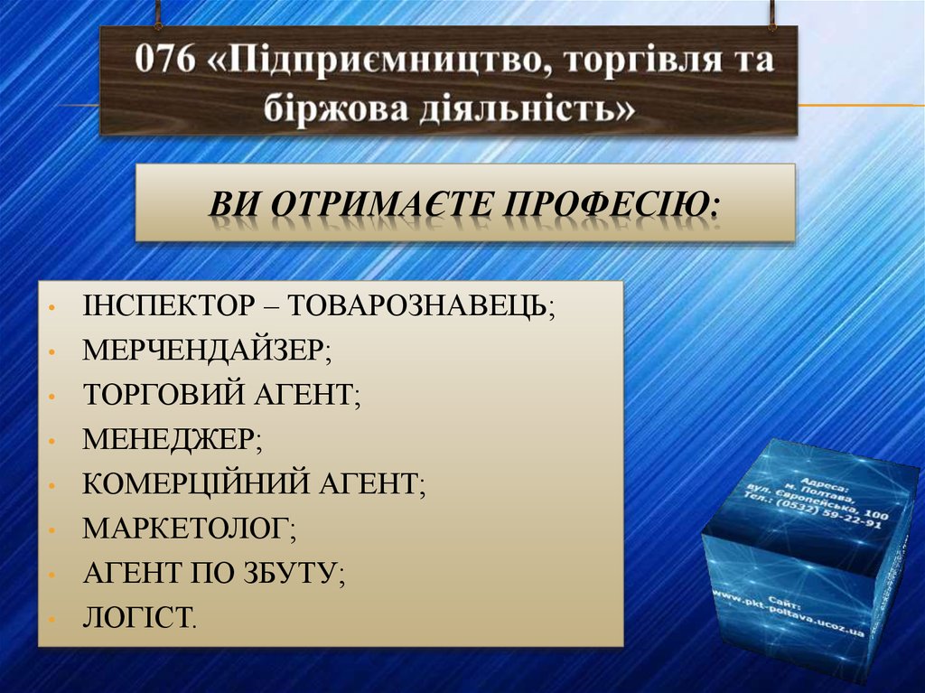 ВИ ОТРИМАЄТЕ ПРОФЕСІЮ:ІНСПЕКТОР – ТОВАРОЗНАВЕЦЬ;