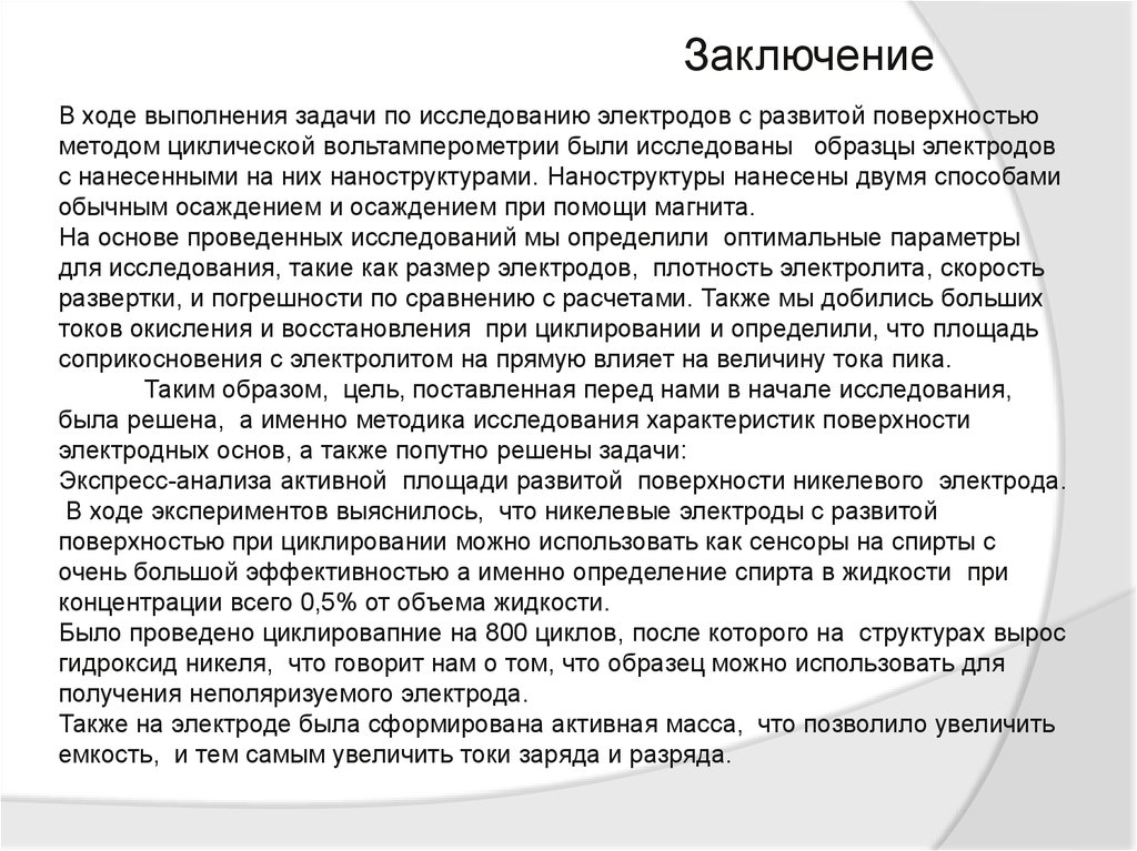 ЗаключениеВ ходе выполнения задачи по исследованию электродов с развитой поверхностью