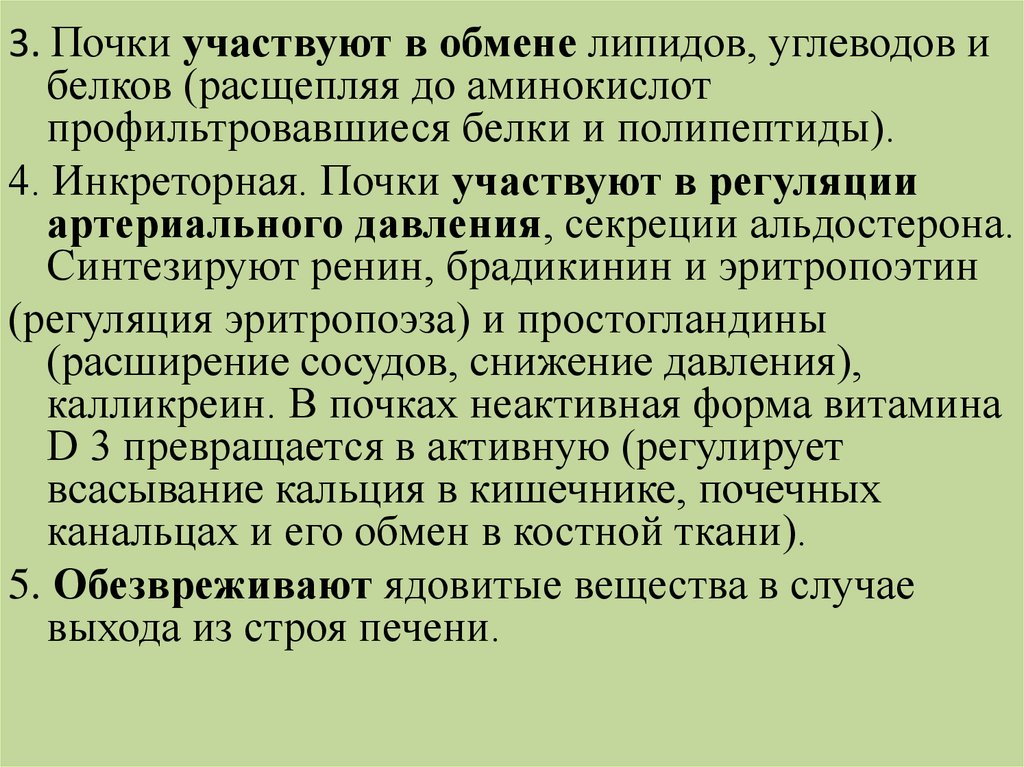 3. Почки участвуют в обмене липидов, углеводов ибелков (расщепляя до аминокислот
