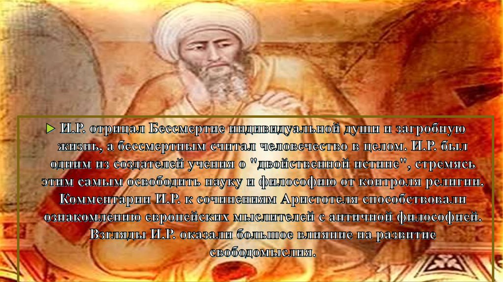 Ибн – Рушд - знаменитый западно-арабскийфилософ. В Западной Европе известен под именем