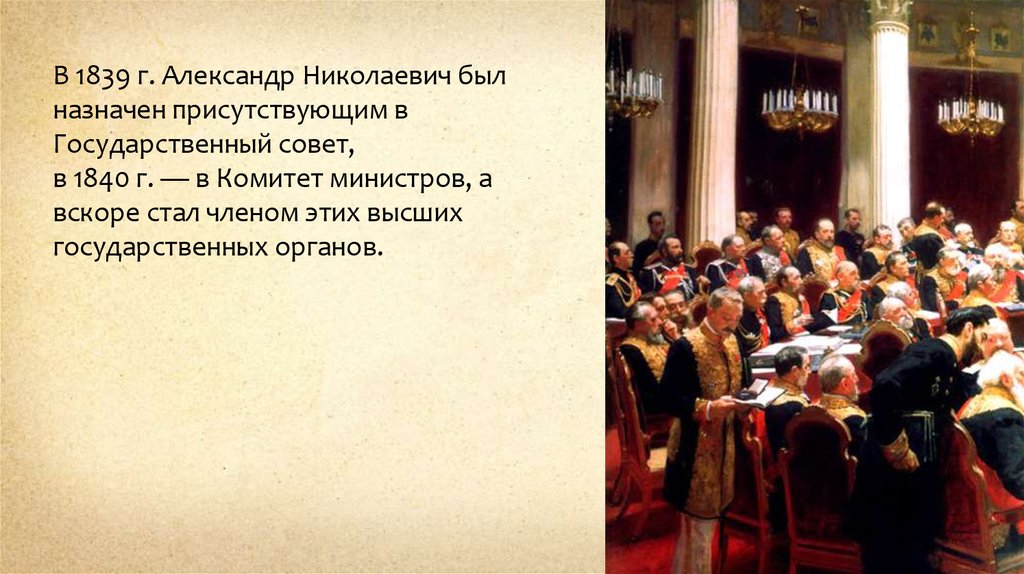 В 1839 г. Александр Николаевич былназначен присутствующим в