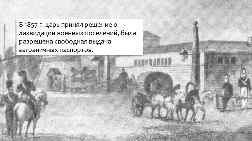 В 1857 г. царь принял решение оликвидации военных поселений, была