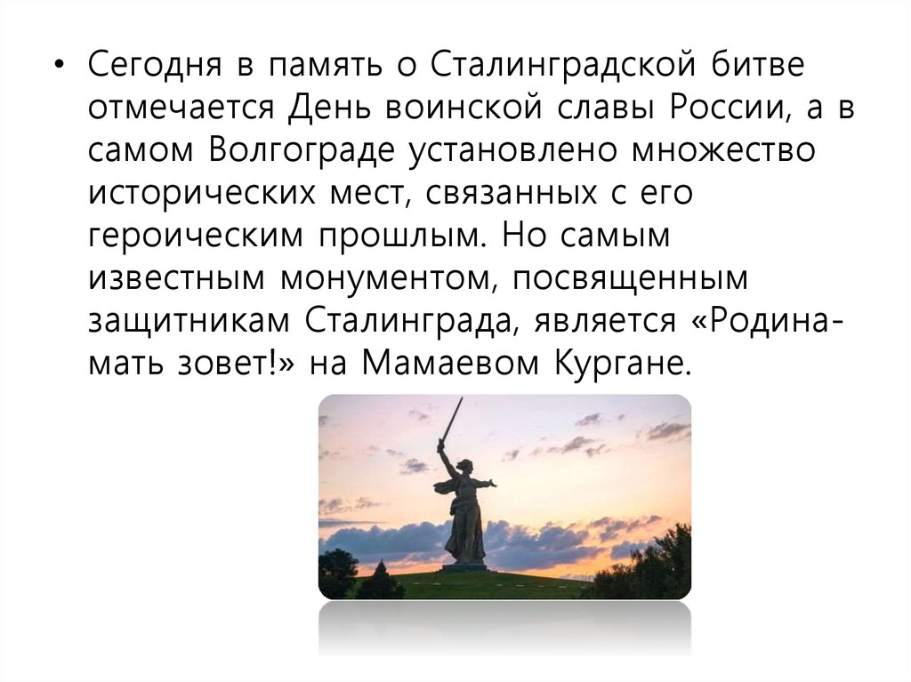 защитникам Сталинграда, является «Родинамать зовет!» на Мамаевом Кургане.