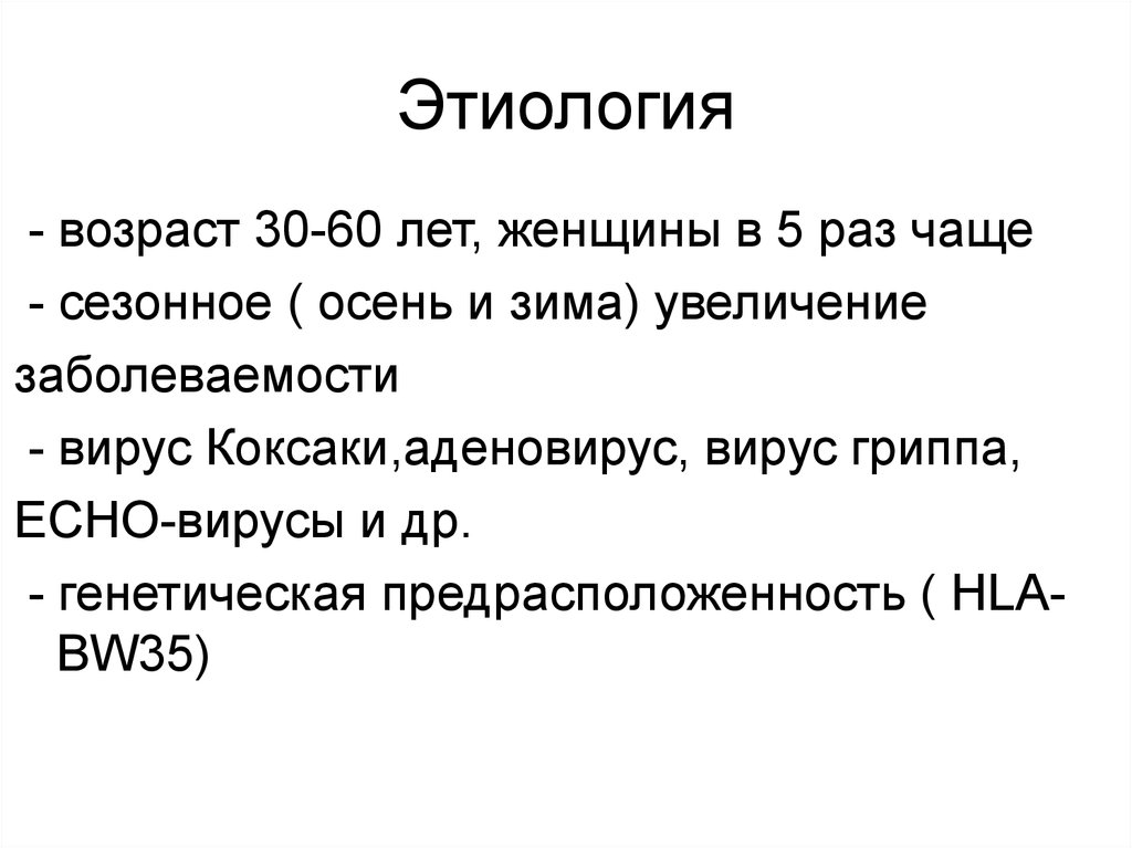 Этиология- возраст 30-60 лет, женщины в 5 раз чаще