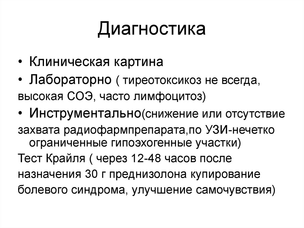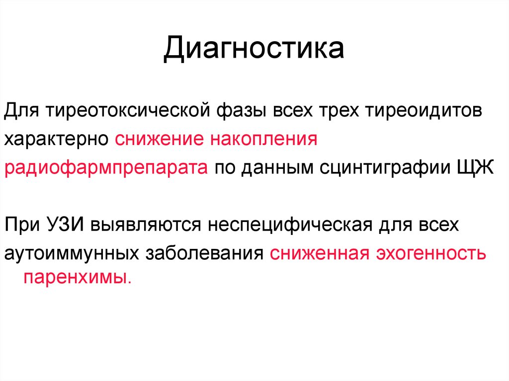 ДиагностикаДля тиреотоксической фазы всех трех тиреоидитов