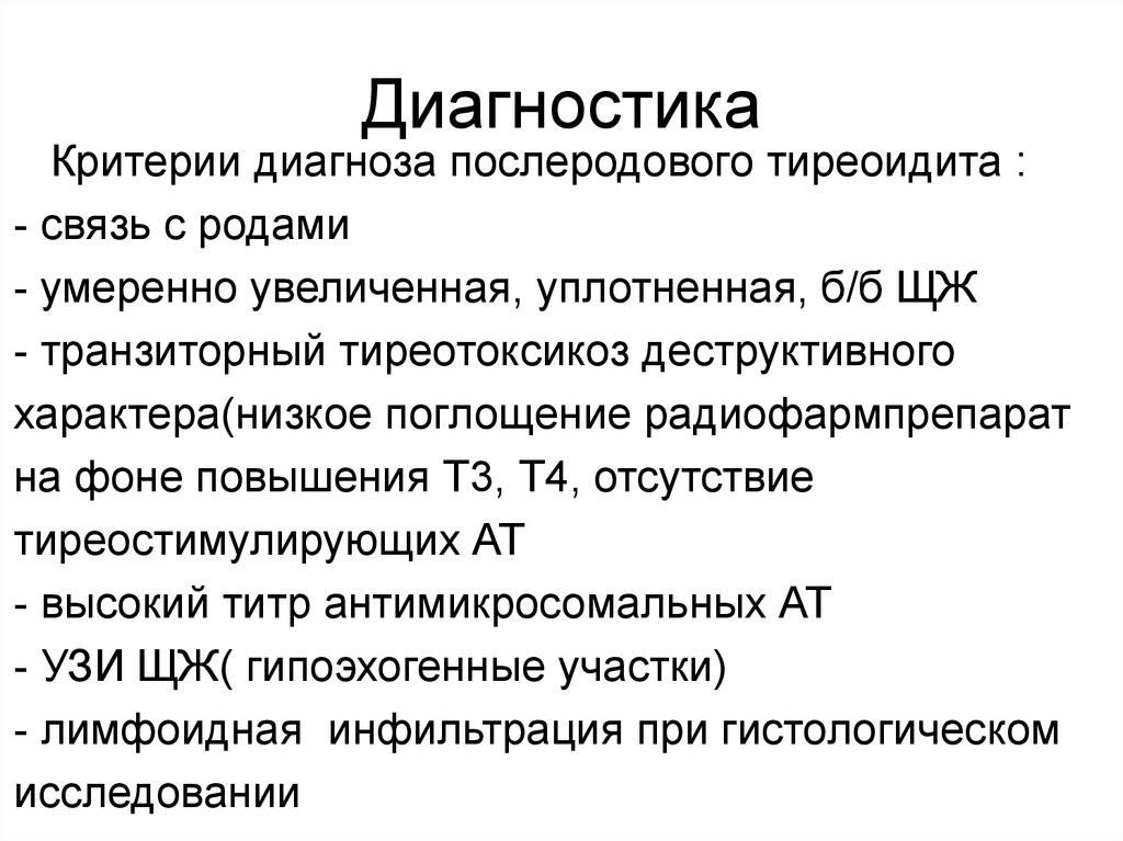 ДиагностикаКритерии диагноза послеродового тиреоидита :