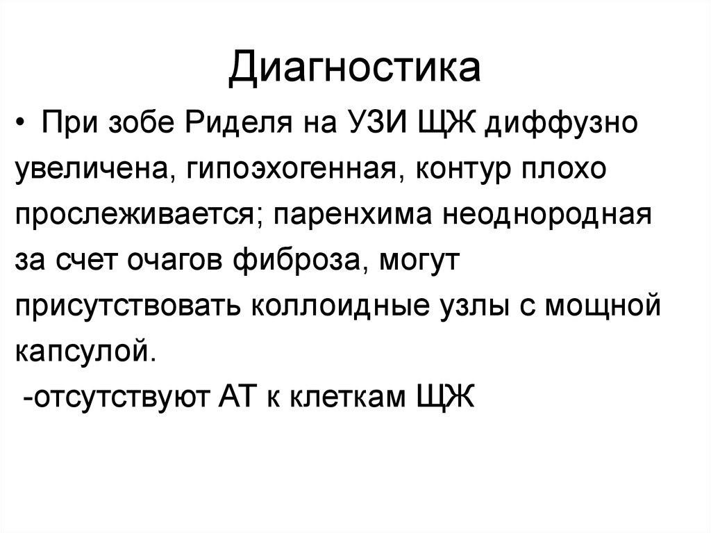 Диагностика• При зобе Риделя на УЗИ ЩЖ диффузно