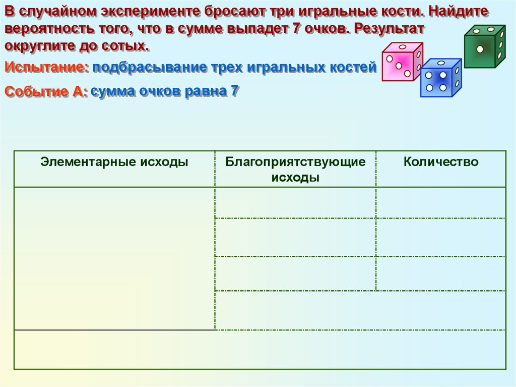 В случайном эксперименте бросают три игральные кости. Найдитевероятность того, что в сумме выпадет 7 очков. Результат