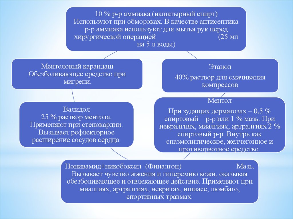 10 % р-р аммиака (нашатырный спирт)Используют при обмороках. В качестве антисептика
