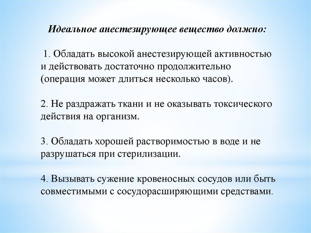 Идеальное анестезирующее вещество должно:1. Обладать высокой анестезирующей активностью