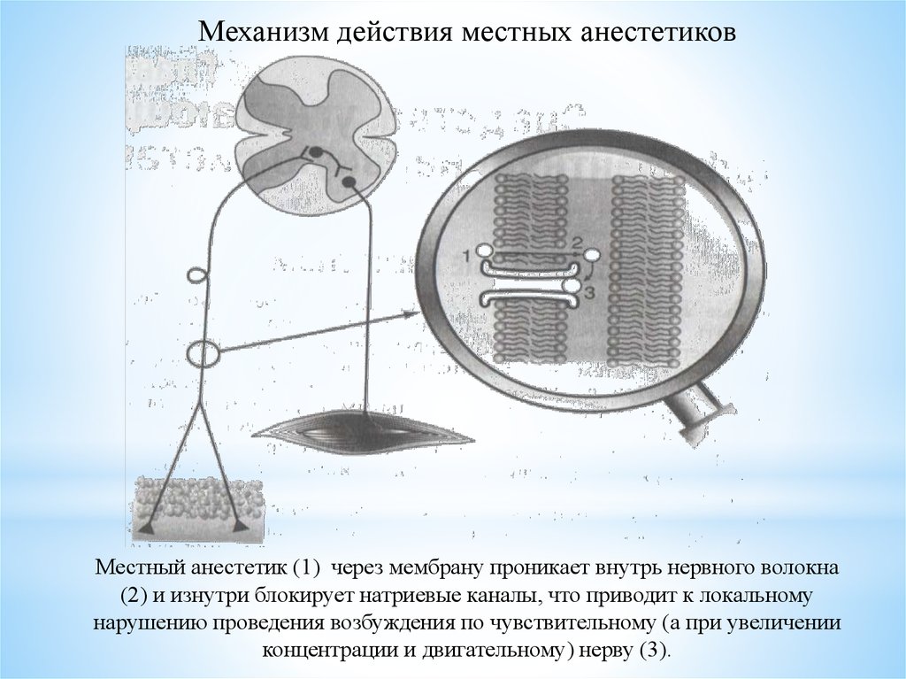 Механизм действия местных анестетиковМестный анестетик (1) через мембрану проникает внутрь нервного волокна