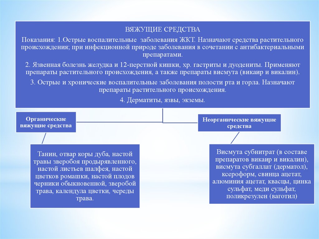ВЯЖУЩИЕ СРЕДСТВАПоказания: 1.Острые воспалительные заболевания ЖКТ. Назначают средства растительного