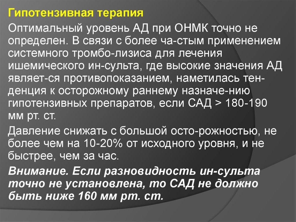 Гипотензивная терапияОптимальный уровень АД при ОНМК точно не