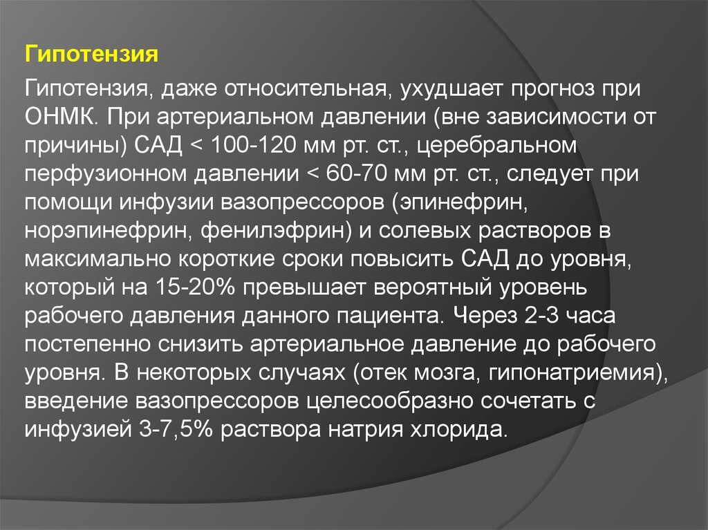 Рекомендуется снижение артериального давления до САД 140 мм рт. ст., и егоподдержание на таком уровне не менее 24 часов.