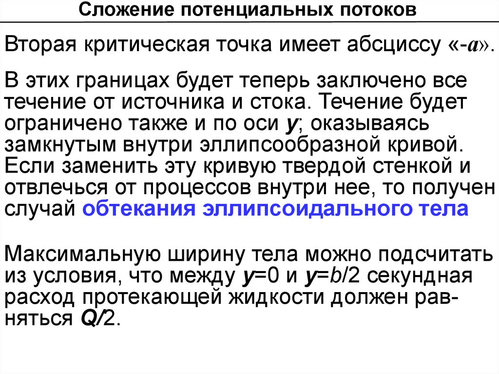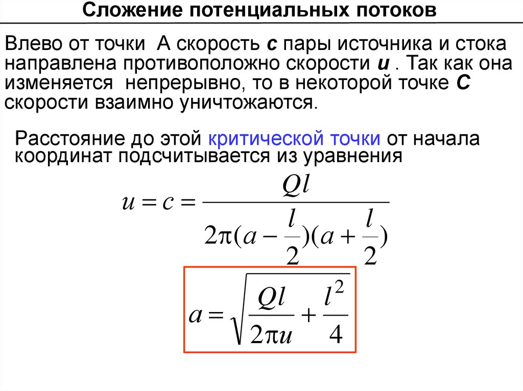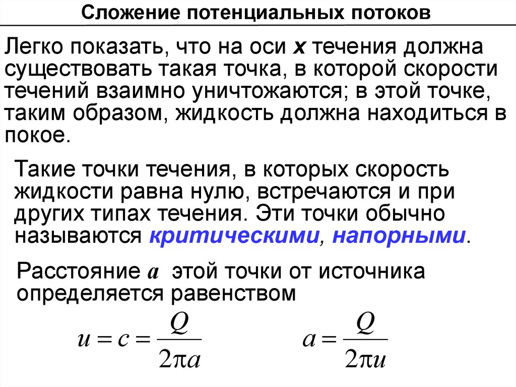 Сложение потенциальных потоковВторая критическая точка имеет абсциссу «-а».