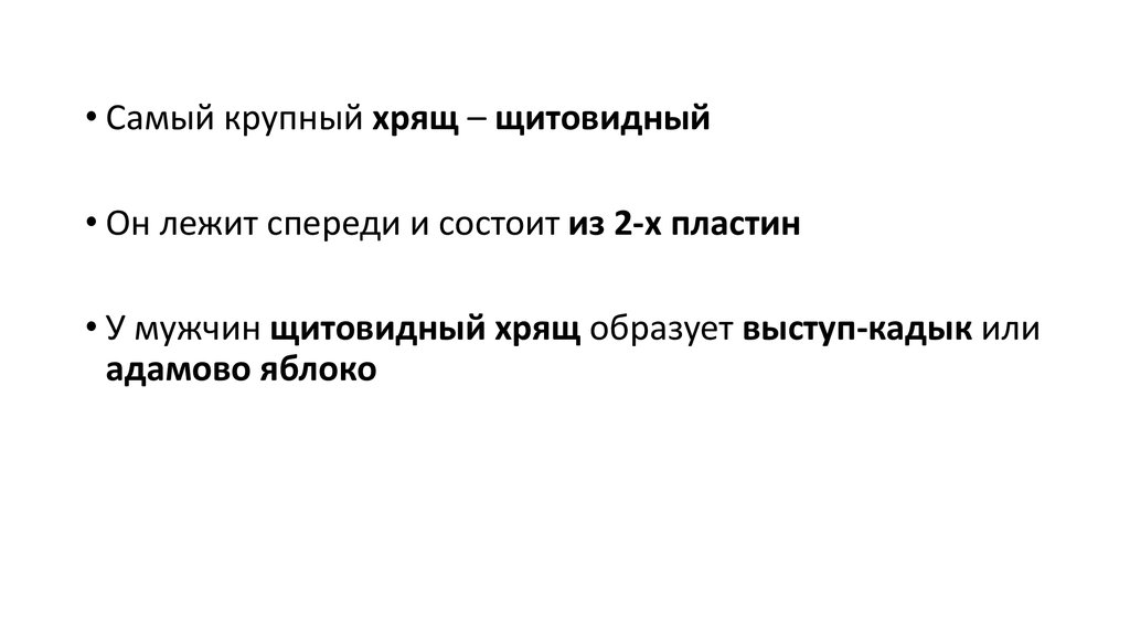• Самый крупный хрящ – щитовидный• Он лежит спереди и состоит из 2-х пластин