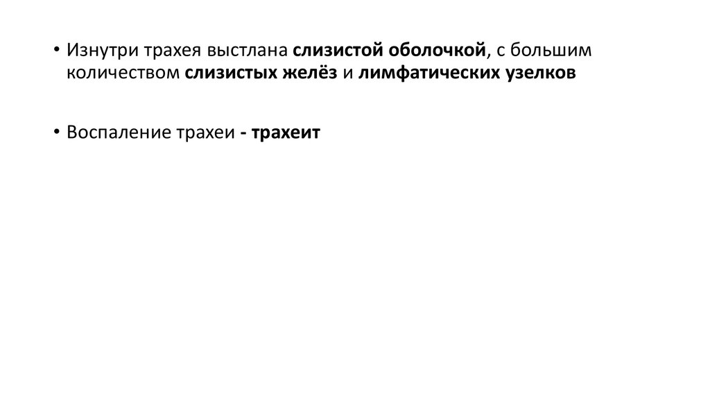 • Изнутри трахея выстлана слизистой оболочкой, с большимколичеством слизистых желёз и лимфатических узелков