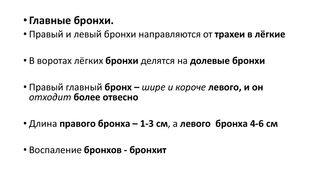 • Длина правого бронха – 1-3 см, а левого бронха 4-6 см