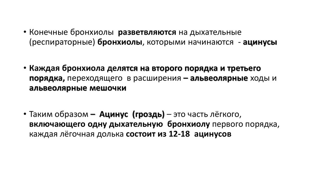 • Конечные бронхиолы разветвляются на дыхательные(респираторные) бронхиолы, которыми начинаются - ацинусы