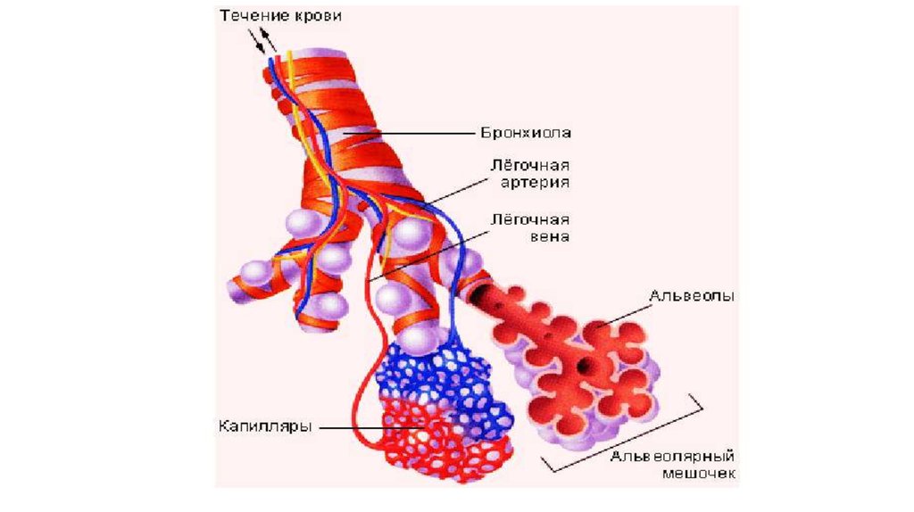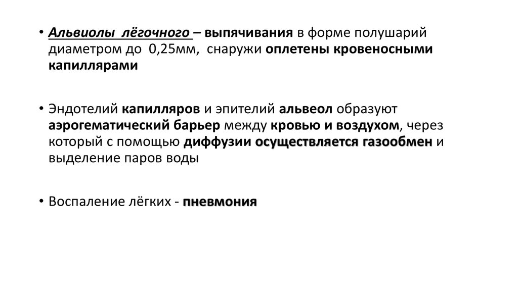 • Альвиолы лёгочного – выпячивания в форме полушарийдиаметром до 0,25мм, снаружи оплетены кровеносными