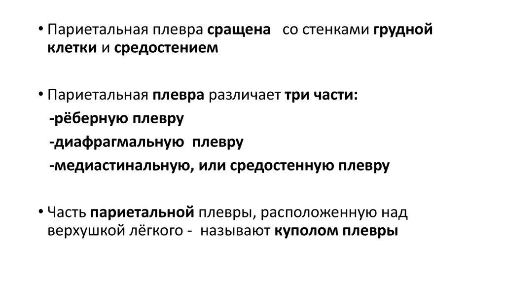 • Париетальная плевра различает три части: