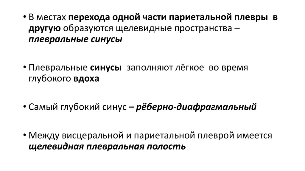 • В местах перехода одной части париетальной плевры вдругую образуются щелевидные пространства –