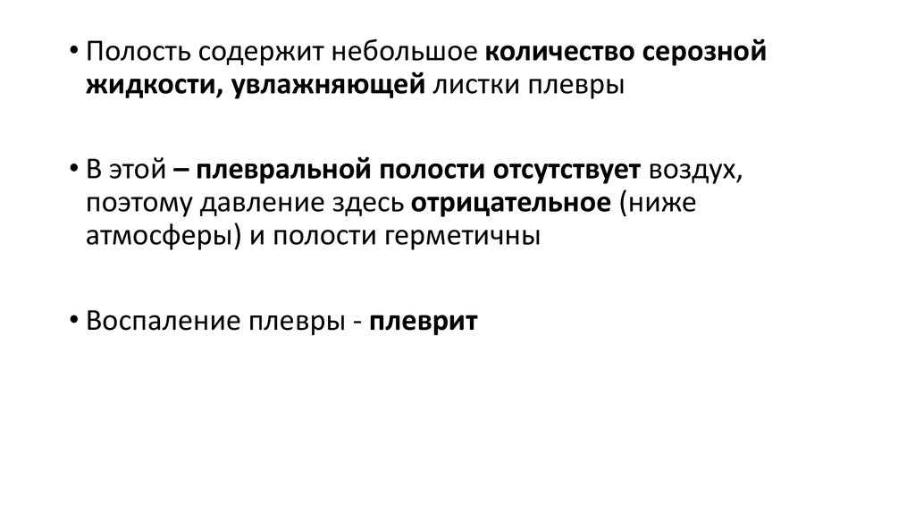 • Полость содержит небольшое количество серознойжидкости, увлажняющей листки плевры