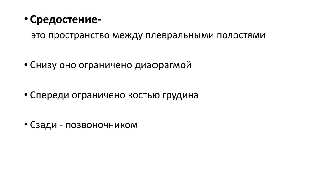 • Средостениеэто пространство между плевральными полостями• Снизу оно ограничено диафрагмой