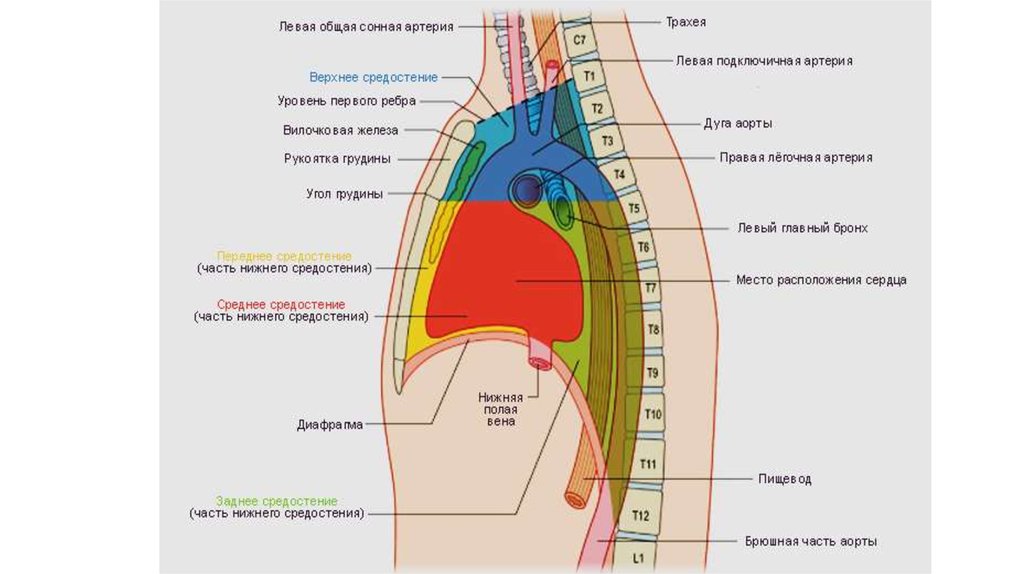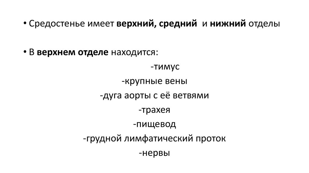 • Средостенье имеет верхний, средний и нижний отделы• В верхнем отделе находится: