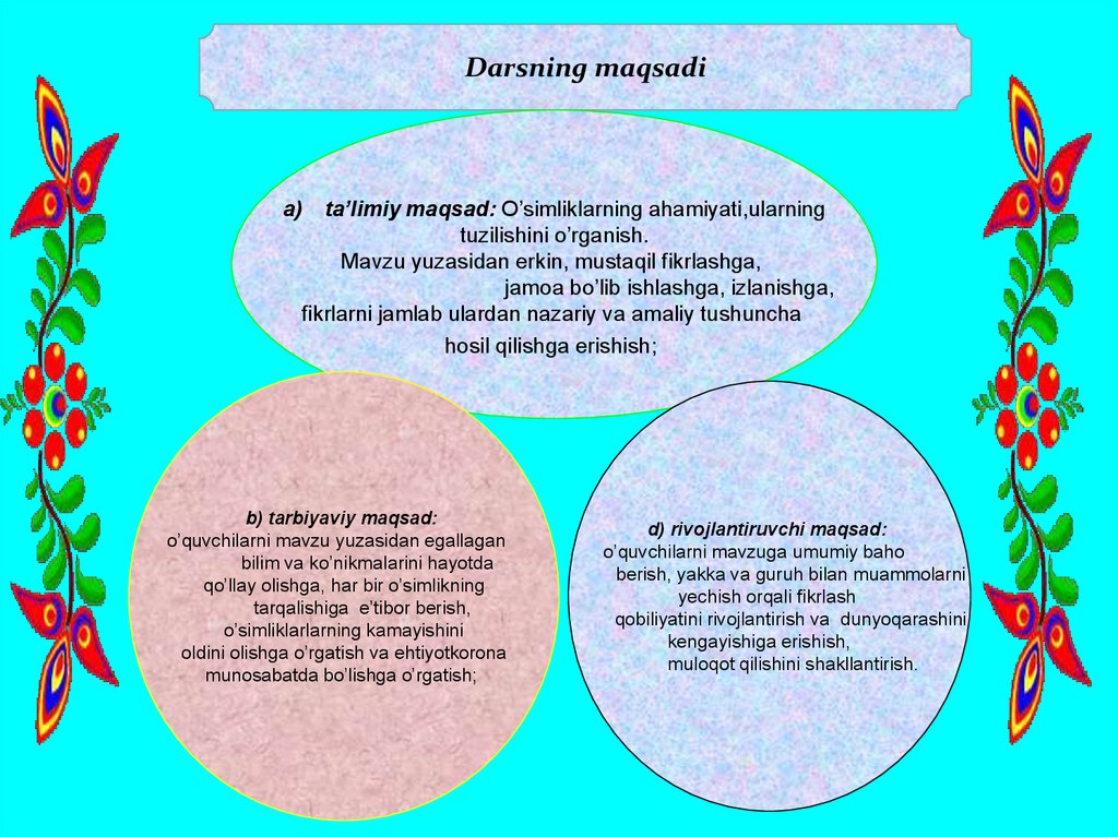 Darsning maqsadita’limiy maqsad: O’simliklarning ahamiyati,ularning