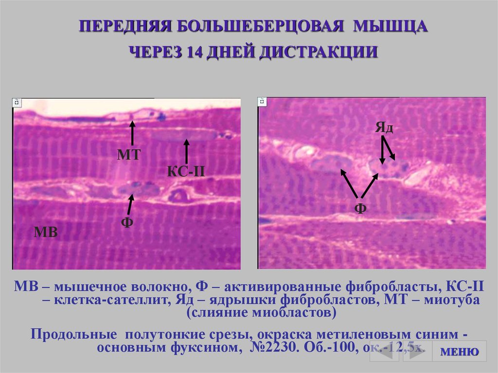 – клетка-сателлит, Яд – ядрышки фибробластов, МТ – миотуба