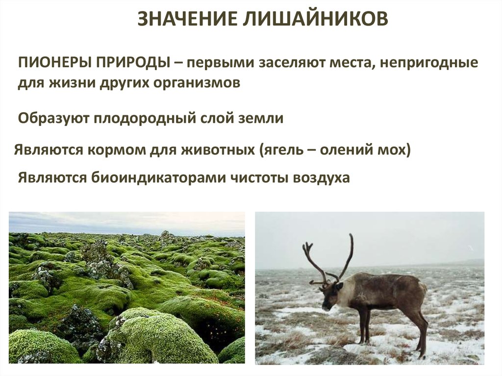 ЗНАЧЕНИЕ ЛИШАЙНИКОВПИОНЕРЫ ПРИРОДЫ – первыми заселяют места, непригодные