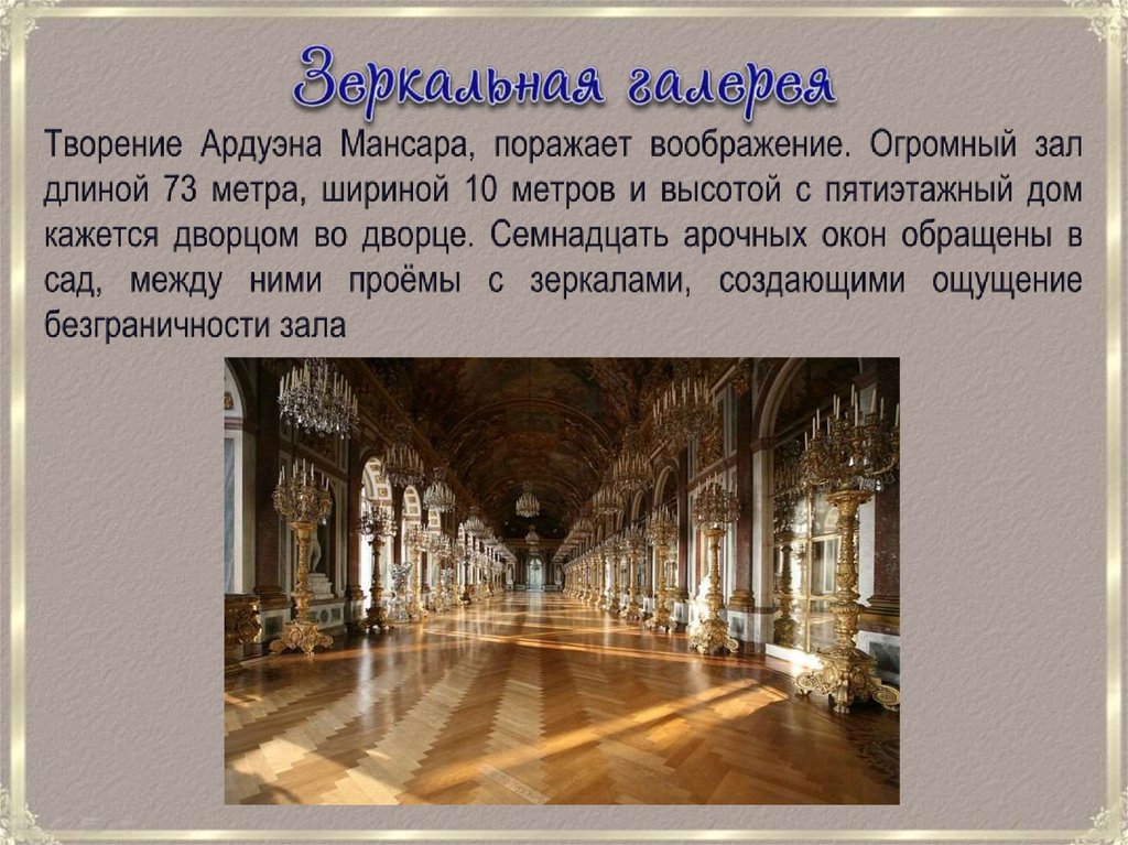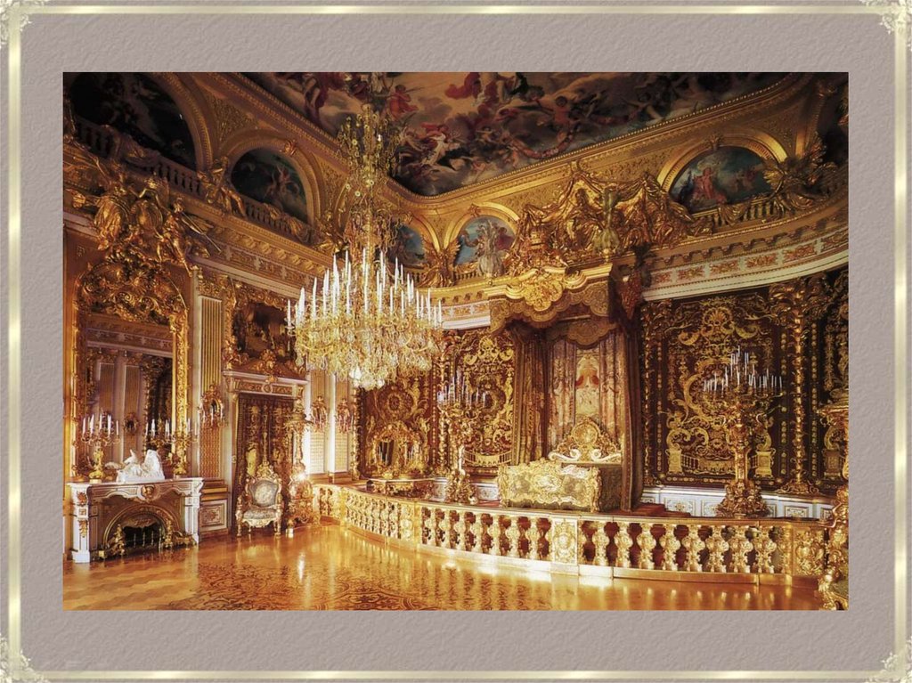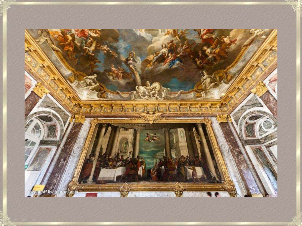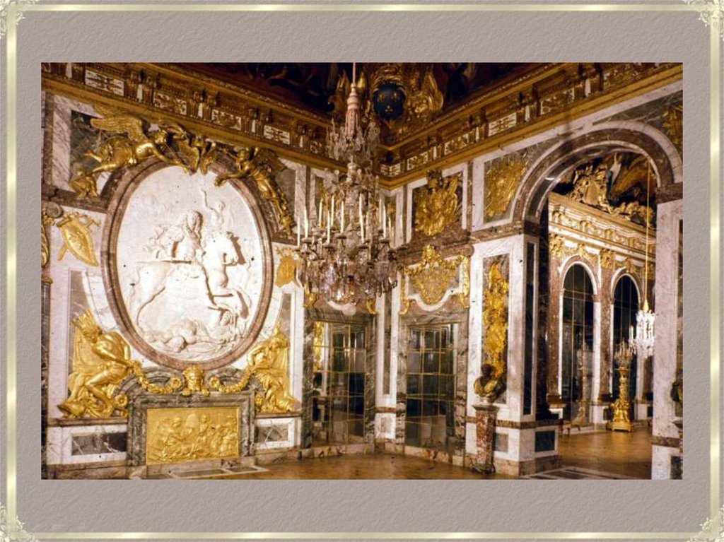Во времена Короля-Солнце вся мебель зала, а также статуи былиотлиты из серебра. Блеск люстр из богемского хрусталя, консоли из
