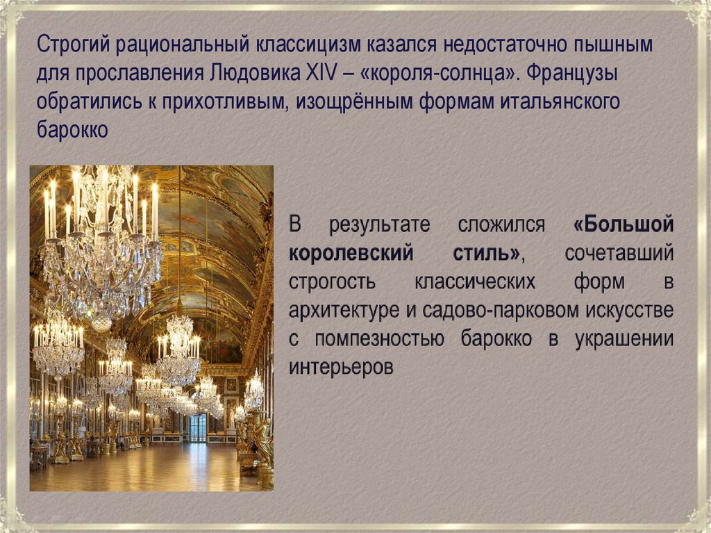 Строгий рациональный классицизм казался недостаточно пышнымдля прославления Людовика ХIV – «короля-солнца». Французы