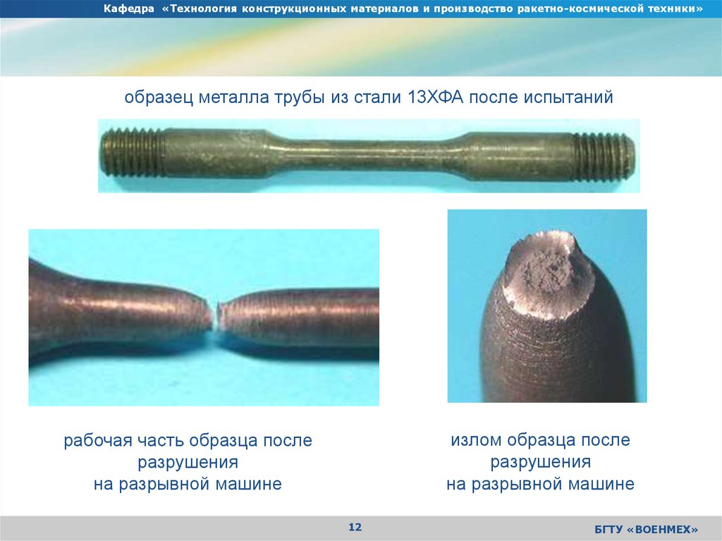 Кафедра «Технология конструкционных материалов и производство ракетно-космической техники»образец металла трубы из стали 13ХФА после испытаний