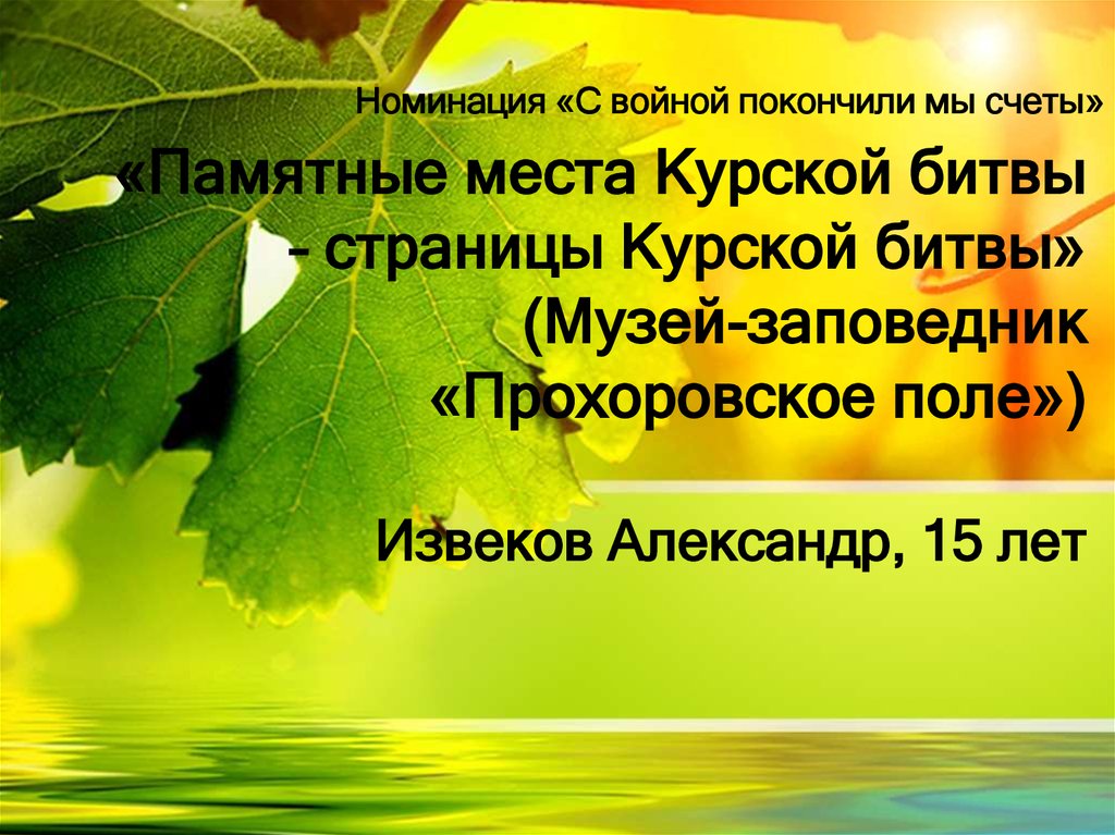 1. «Памятные места Курской битвы – страницы Курской битвы» (Музей-заповедник «Прохоровское поле») Извеков Александр, 15 лет