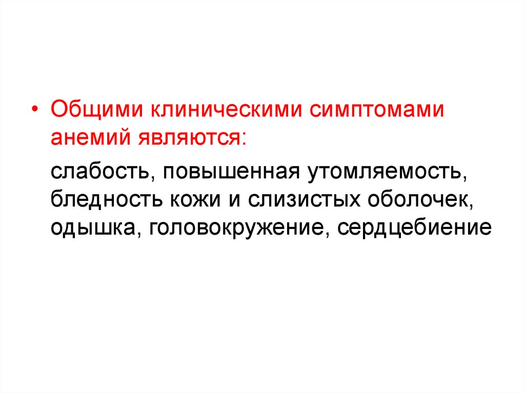 • Общими клиническими симптомамианемий являются: