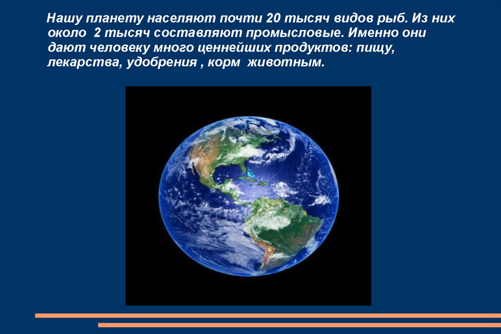 Нашу планету населяют почти 20 тысяч видов рыб. Из нихоколо 2 тысяч составляют промысловые. Именно они