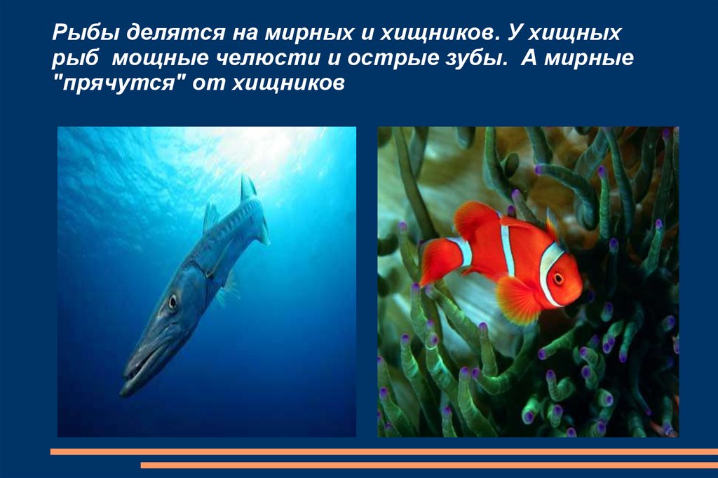 Рыбы делятся на мирных и хищников. У хищныхрыб мощные челюсти и острые зубы. А мирные