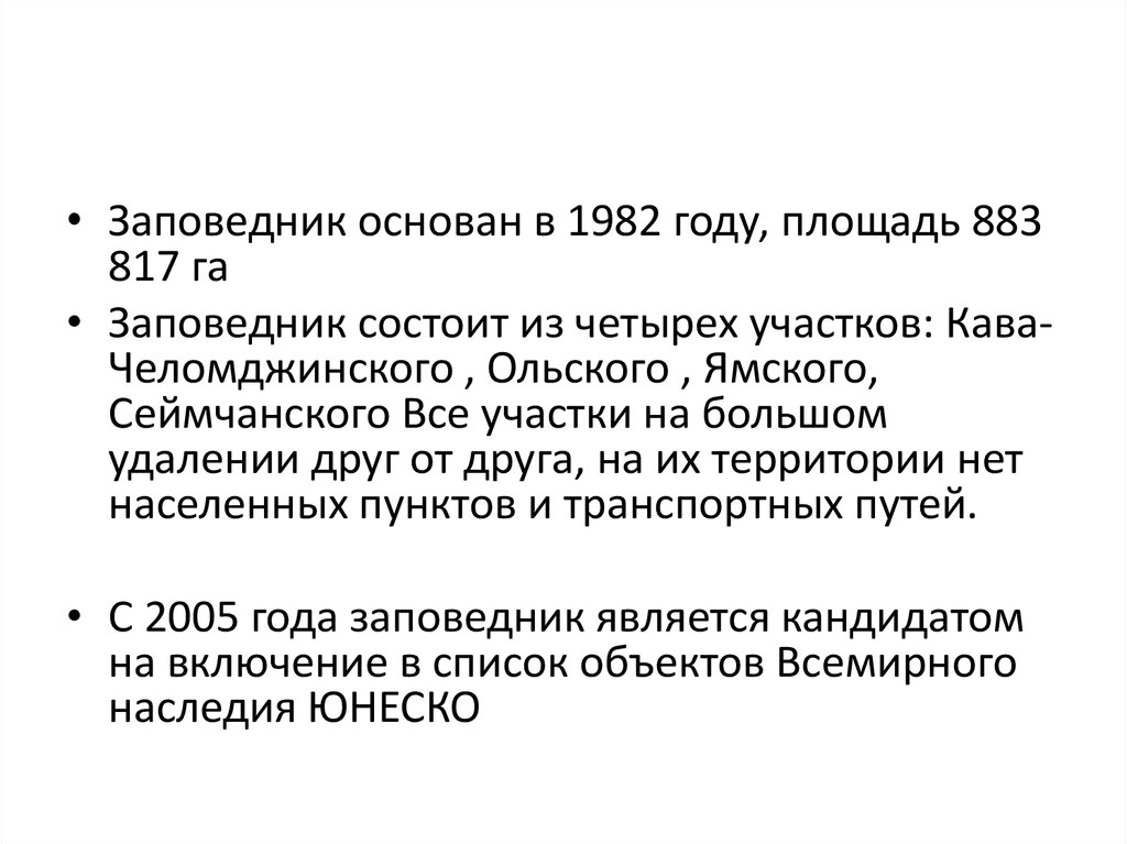 • Заповедник состоит из четырех участков: КаваЧеломджинского , Ольского , Ямского,