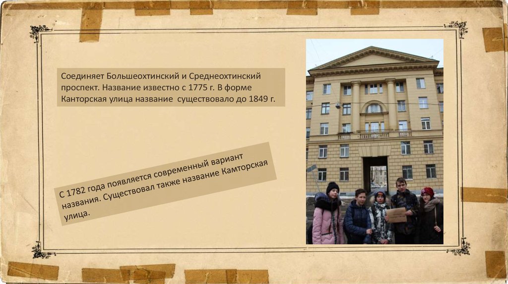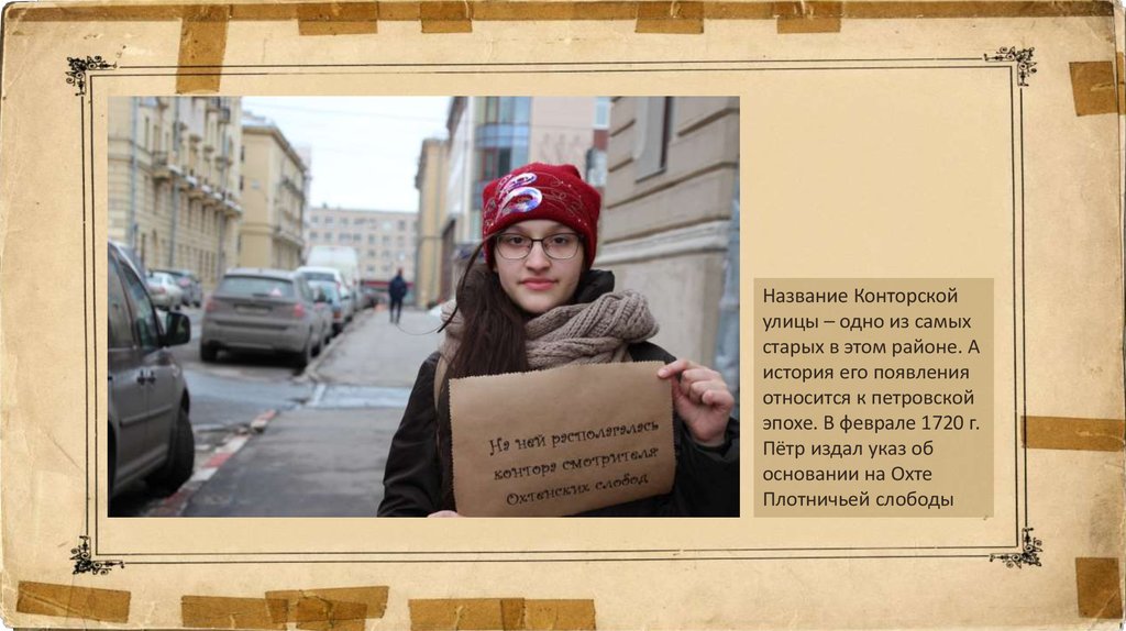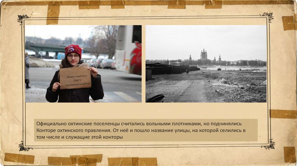 Официально охтинские поселенцы считались вольными плотниками, но подчинялисьКонторе охтинского правления. От неё и пошло название улицы, на которой селились в