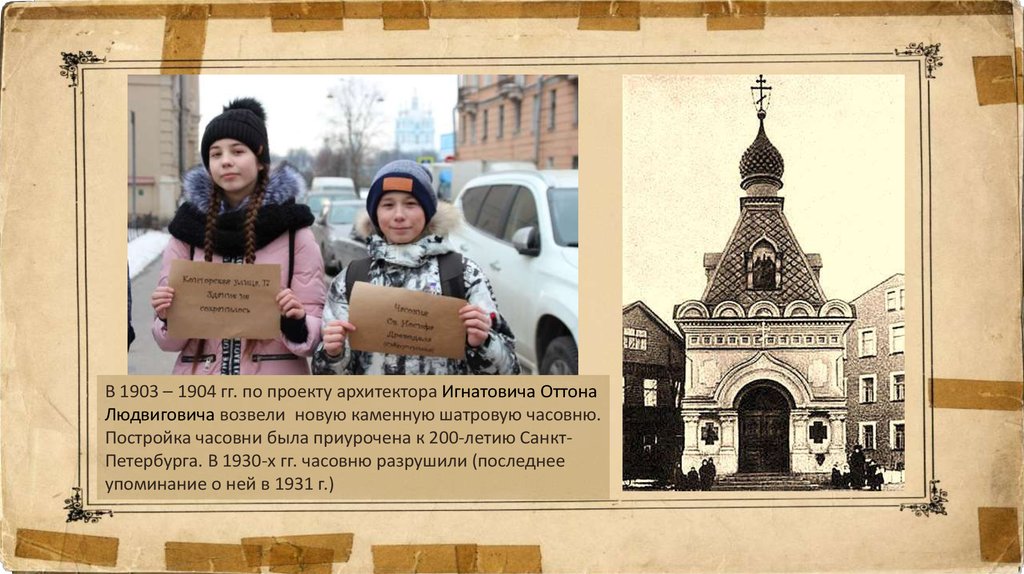 Постройка часовни была приурочена к 200-летию СанктПетербурга. В 1930-х гг. часовню разрушили (последнее