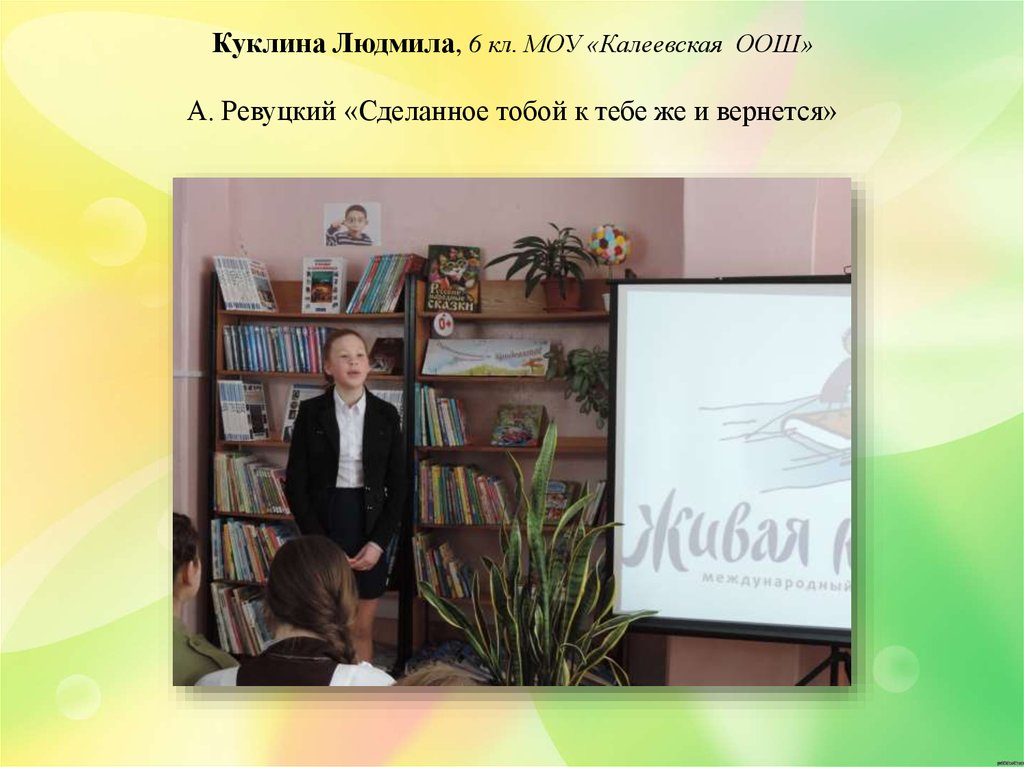 Куклина Людмила, 6 кл. МОУ «Калеевская ООШ»А. Ревуцкий «Сделанное тобой к тебе же и вернется»