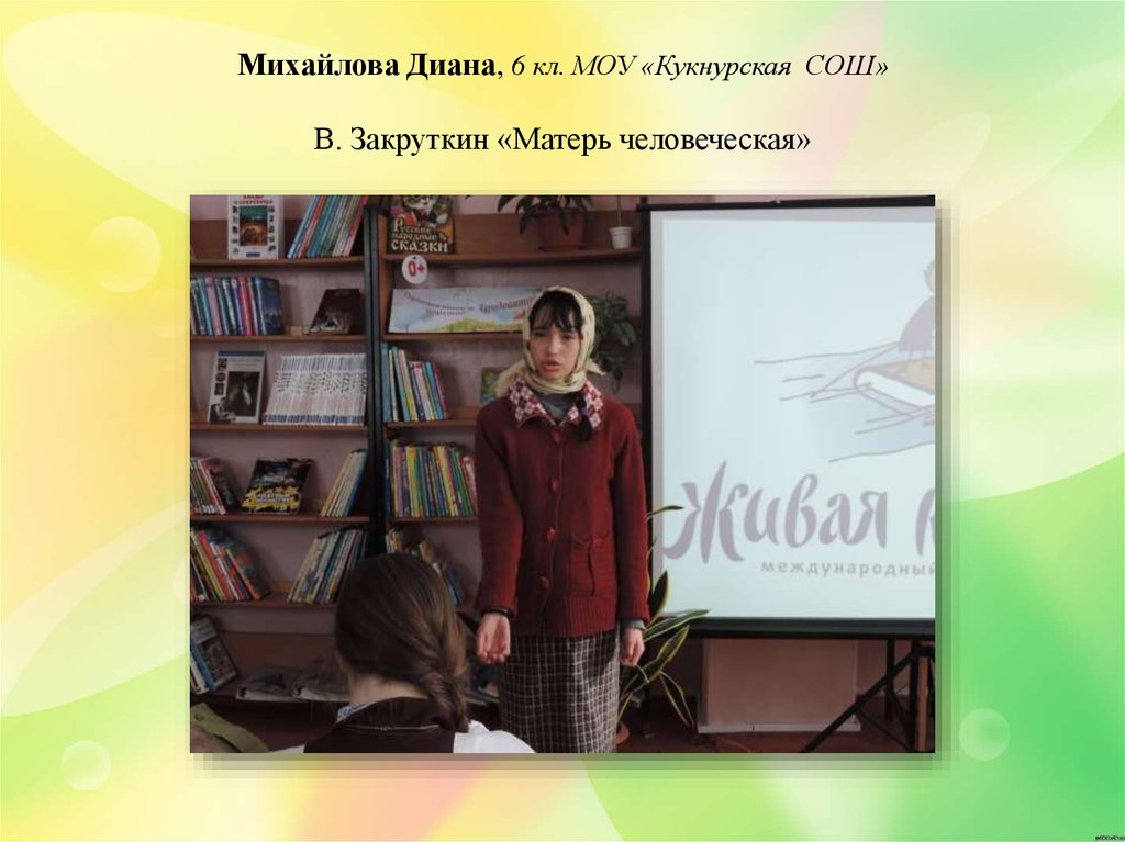Михайлова Диана, 6 кл. МОУ «Кукнурская СОШ»В. Закруткин «Матерь человеческая»