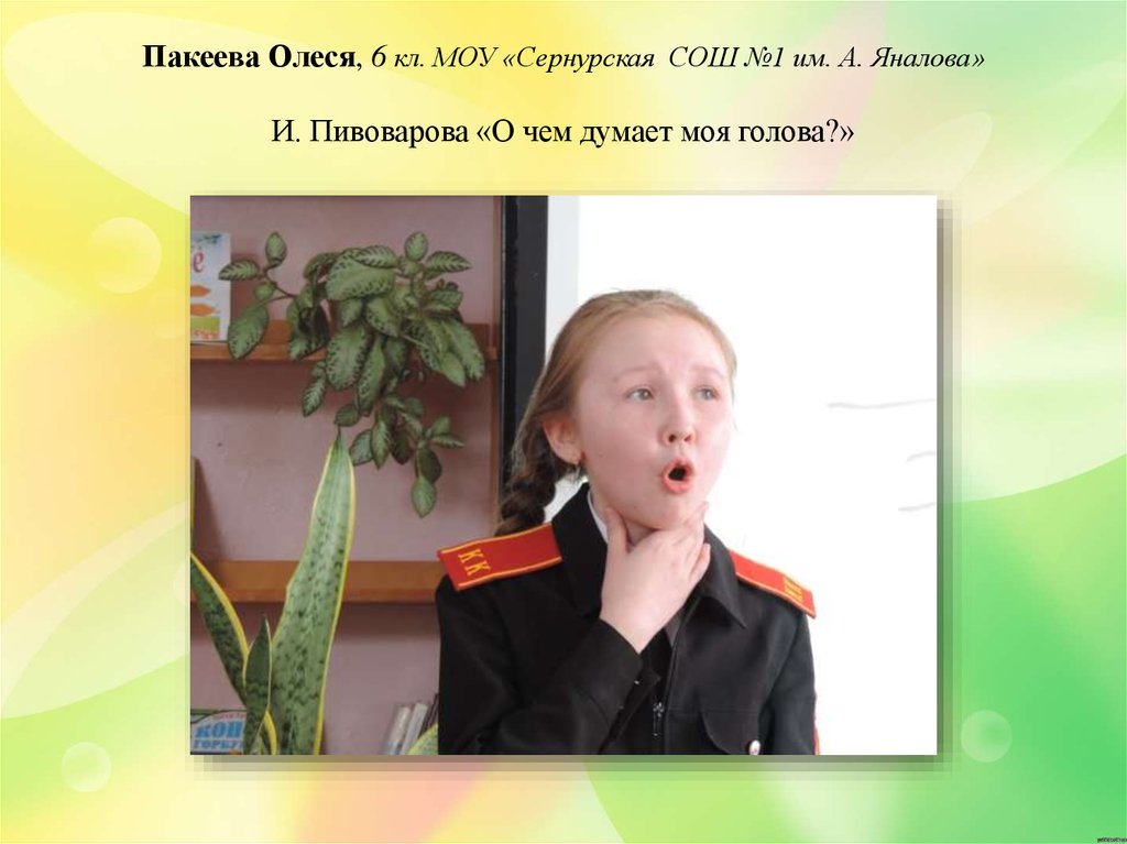 Пакеева Олеся, 6 кл. МОУ «Сернурская СОШ №1 им. А. Яналова»И. Пивоварова «О чем думает моя голова?»