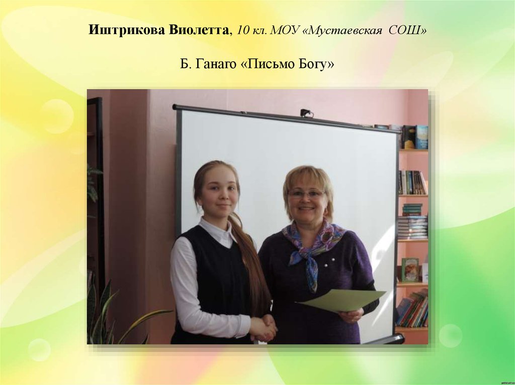 Иштрикова Виолетта, 10 кл. МОУ «Мустаевская СОШ»Б. Ганаго «Письмо Богу»