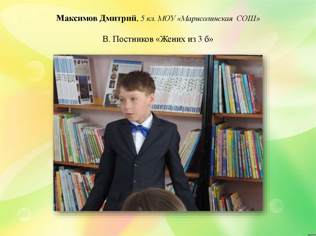Максимов Дмитрий, 5 кл. МОУ «Марисолинская СОШ»В. Постников «Жених из 3 б»