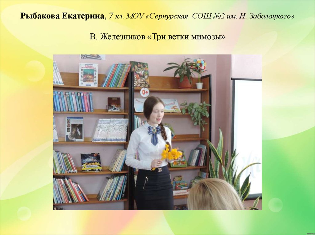Рыбакова Екатерина, 7 кл. МОУ «Сернурская СОШ №2 им. Н. Заболоцкого»В. Железников «Три ветки мимозы»