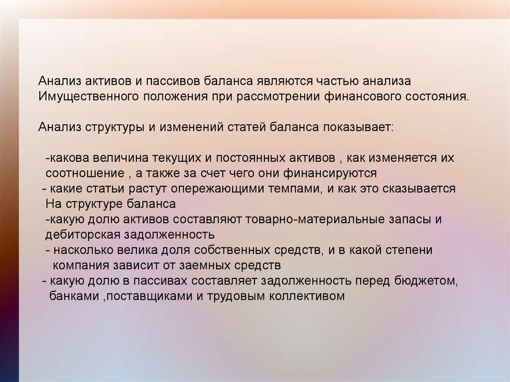 Анализ активов и пассивов баланса являются частью анализаИмущественного положения при рассмотрении финансового состояния.